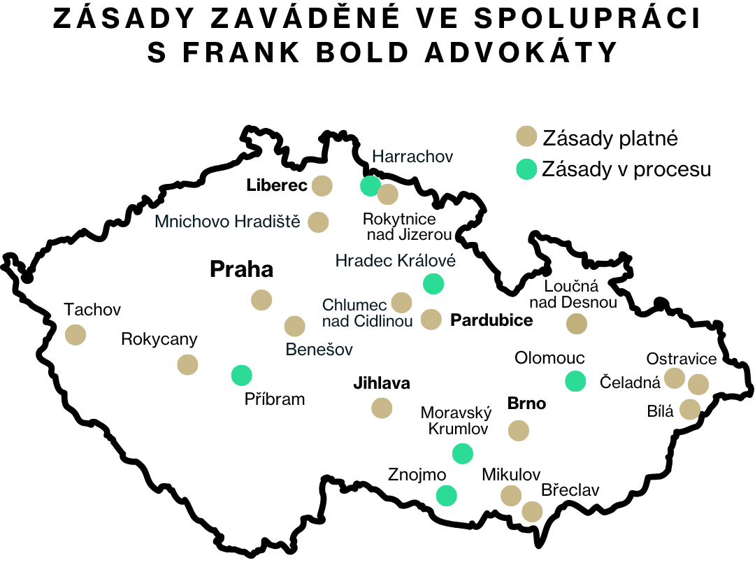 Frank Bold Advokáti připravili zásady spolupráce pro desítky měst napříč Českem, a to včetně velkých města, jako je Praha, Brno nebo Jihlava, ale také s radou menších jako Čeladná, Mikulov nebo Ostravice. S řadou dalších Frank Bold Advokáti spolupracovali na vyjednávání a uzavírání plánovacích smluv spojených s konkrétními projekty v praxi.