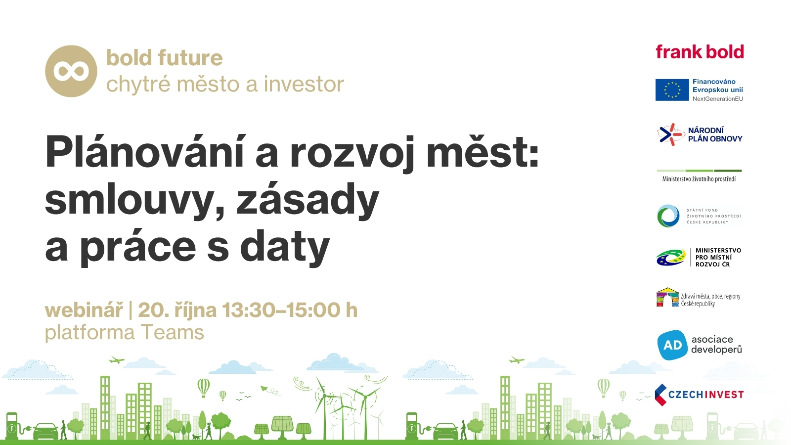 Připojte se 20. října na webinář platformy Chytré město a investor zaměřený na praktické aspekty plánování rozvoje měst. Čekají vás tři prezentace a velký prostor bude věnovaný i přímo vašim otázkám.